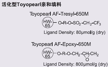 ?????? Toyopearl AF-Epoxy-650M活化型填料,也是干燥包裝,具有高密度的環(huán)氧基團(tuán)(ca. 800μmol/ml)。在適當(dāng)?shù)姆磻?yīng)條件下,可用于固定蛋白質(zhì)或低分子配體。當(dāng)結(jié)合高密度低分子配體時(shí)特別有效。例如,谷胱甘肽和甘氨酸的耦合密度可達(dá)到大于100μmol/ml濕狀填料。Toyopearl AF-Epoxy-650M是一種多功能的原材料,可連接其他特殊應(yīng)用所需的化學(xué)活性基團(tuán)。這種填料可輕松被激活為含有酰肼的物質(zhì)。這對(duì)固定碳水化合物或糖蛋白特別有用。
