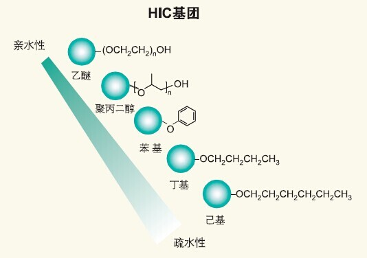 ??? 東曹公司提供5種具有不同疏水性和選擇性的HIC填料。疏水性由弱到強(qiáng)的順序?yàn)椋阂颐眩?/span>Ether),聚丙二醇(PPG),苯基(Phenyl),丁基(Butyl),己基(Hexyl)。Toyopearl Hexyl和Butyl常用來(lái)分離低疏水性的蛋白;Toyopearl Ether常用來(lái)純化疏水性很強(qiáng)的蛋白質(zhì),比如單克隆抗體和膜蛋白,這兩種蛋白會(huì)和其他疏水介質(zhì)結(jié)合的非常牢固而導(dǎo)致低的回收率。若客戶對(duì)樣品的疏水性不十分清楚,一般建議客戶先選用中等疏水性的Toyopearl Phenyl做條件的摸索。