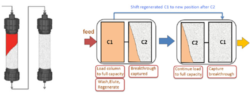 傳統(tǒng)親和層析工藝,由于流穿效應(yīng),有40-60%的填料是無法被利用的,從而使得載量和處理量大為受限。Capture SMB用于優(yōu)化捕獲環(huán)節(jié),作為最簡單和最強(qiáng)大的2柱位設(shè)計(jì),可使純化效率顯著提高,并且使填料用量大為縮減。