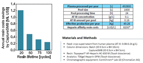 從預(yù)處理血漿中捕獲AT-III通常采用肝素親和層析法。將單柱Batch工藝與Capture SMB進(jìn)行對(duì)比實(shí)驗(yàn),使用親和填料TOYOPEARL? AF-Heparin?HC-650M,用血漿上清液(AT-III:0.08-0.24 g/L)進(jìn)行上樣,采用TSKgel Heparin-5PW分析柱進(jìn)行濃度測定,最終研究表明,采用Capture SMB,可使填料載量提高45%,產(chǎn)率提高38%,同時(shí)使緩沖液消耗量降低29%。