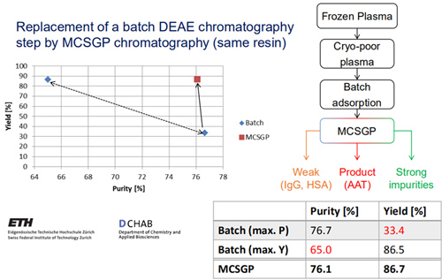 從血漿中純化AAT需采用DEAE離子交換層析,有研究表明,采用單柱Batch工藝純化AAT,產(chǎn)品純度76.7%時(shí),收率為33.4%;產(chǎn)品純度65.0%時(shí),收率為86.5%,純度和收率此消彼長。采用MCSGP工藝后,可在產(chǎn)品純度76.1%時(shí),仍保證收率為86.7%。