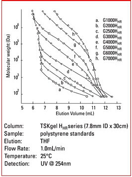 3. Hhr型色譜柱為常規(guī)的GPC色譜柱,尺寸為7.8mm ID×30cm。當(dāng)使用此類常規(guī)色譜柱時,大多數(shù)的HPLC系統(tǒng)無需進(jìn)行針對柱外峰展效應(yīng)的優(yōu)化。