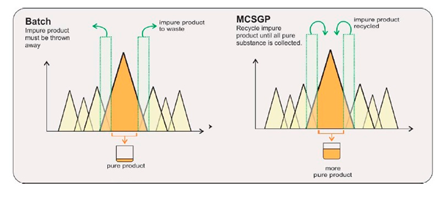 ????? MCSGP(Multicolumn Countercurrent Solvent Gradient Purification)用于精純環(huán)節(jié),無需通過耗時的實驗設計(DoE)確定工藝條件,可有效克服典型SMB(模擬移動床)僅適用于二元分離、無法實現(xiàn)線性梯度的缺點。
