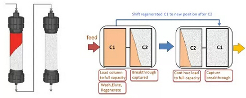 ? ? ? ?Capture SMB是將第一根層析柱的上樣流穿繼續(xù)上樣至第二根層析柱,待第一根層析柱完全滿載后,方結(jié)束其上樣,進行淋洗、洗脫等操作,而此時第二根層析柱仍在繼續(xù)上樣。通過切換柱位操作,保證2根層析柱的洗脫、再生、上樣等操作交替銜接進行,保證連續(xù)上樣,從而實現(xiàn)工藝與系統(tǒng)硬件設(shè)計的高度契合,使填料利用率最大化,用量大為縮減。