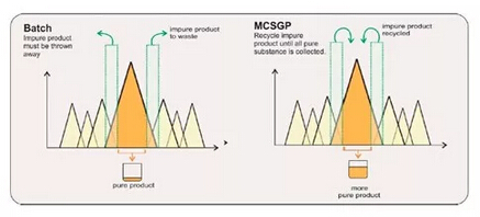 ? ? ? MCSGP工藝,可將含有不純組分的產(chǎn)品回收在一個封閉的環(huán)內(nèi),進行循環(huán)式的層析操作,從而最大限度地提取純產(chǎn)品,使得收率和純度二者兼得。