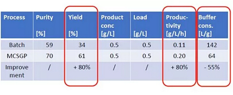 ? ? 有案例證明,MCSGP可將產(chǎn)品純度從傳統(tǒng)工藝的59%提升至70%,將收率從傳統(tǒng)工藝的34%提升至61%,從而使產(chǎn)量(g /L /h)整體提升80%,并同時使Buffer的消耗量降低55%。MCSGP工藝,無疑可顯著地節(jié)約成本投入,并可產(chǎn)生更多的生產(chǎn)效益。