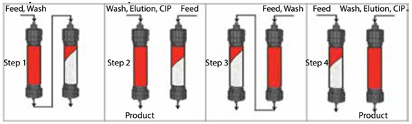 ? ? ?Capture SMB是將第一根層析柱的抗體/蛋白流穿繼續(xù)上樣至第二根層析柱,待第一根層析柱完全滿載后,方結(jié)束其上樣進(jìn)行淋洗,并繼續(xù)進(jìn)行洗脫、再生、再平衡操作,而此時(shí)第二根層析柱會(huì)獨(dú)立進(jìn)行上樣操作。通過(guò)切換柱位操作,保證2根層析柱的洗脫、再生、上樣等操作交替銜接進(jìn)行,從而實(shí)現(xiàn)工藝與系統(tǒng)硬件設(shè)計(jì)的完美結(jié)合,使填料利用率最大化,累積用量大為縮減。