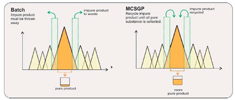 ? ? ??MCSGP(Multicolumn Countercurrent Solvent Gradient Purification)用于精純環(huán)節(jié),可有效克服SMB(模擬移動(dòng)床)僅適用于二元分離、無(wú)法實(shí)現(xiàn)線性梯度的缺點(diǎn)。