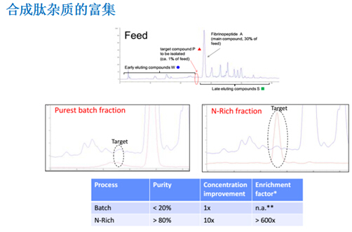 ? ? ??N-Rich工藝是微量物質(zhì)的富集過(guò)程,比如將產(chǎn)品的相關(guān)雜質(zhì)選擇性地富集在一個(gè)循環(huán)的層析過(guò)程中,待富集至目標(biāo)量,再進(jìn)行洗脫回收。該方法特別適用于分離與產(chǎn)品有關(guān)的雜質(zhì),如異構(gòu)體和聚集體,并同時(shí)用于發(fā)現(xiàn)研究。
