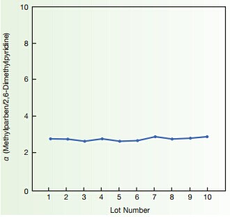 上圖所示,顯示了對羥基苯甲酸甲酯/2,6-二甲基吡啶(Methylparaben/2,6-Dimethylpyridine)在YMC-Pack ODS-AM液相色譜柱上10次的分離因子(α)。YMC公司在生產(chǎn)過程中采用的嚴(yán)格質(zhì)量控制體系,以保證產(chǎn)品生產(chǎn)批間的差異最小,提供高再現(xiàn)性的堿性化合物分析柱。