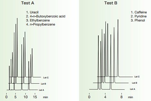 上圖為三批填料測試結(jié)果的比較,其顯示了對(duì)疏水性、親水性、堿性及酸性化合物都具有優(yōu)良的分離再現(xiàn)性。